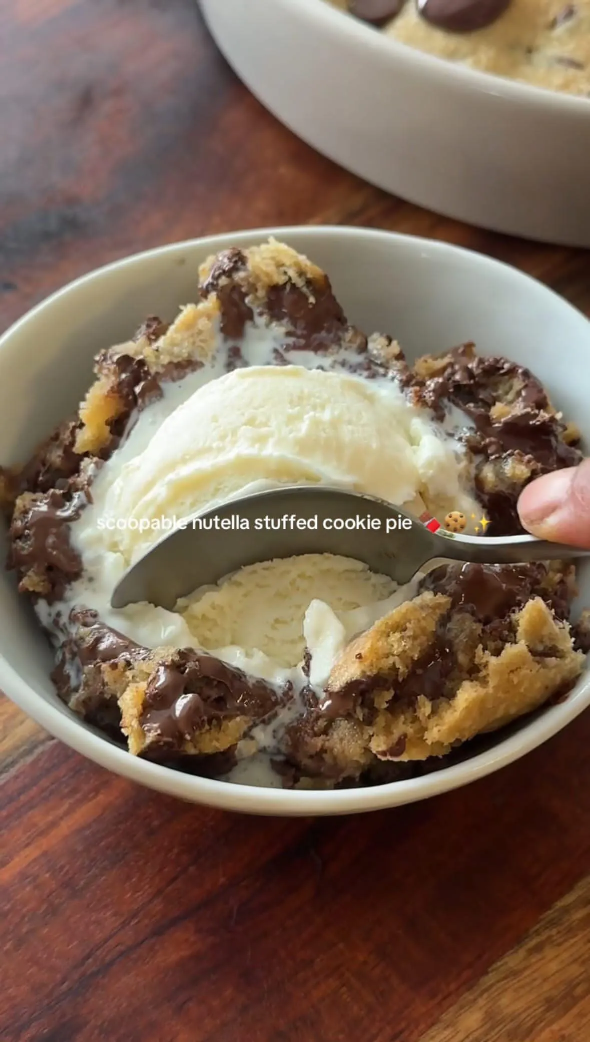 Este postre es pura tentación: bordes dorados y crujientes, centro suave y relleno de Nutella derretida, coronado con una bola de helado de vainilla que se funde lentamente… 🤍🍨 📝 Ingredientes (2 porciones individuales o 1 molde mediano) Para la masa: Para el relleno: Para servir: 👩‍🍳 Preparación Paso a Paso
