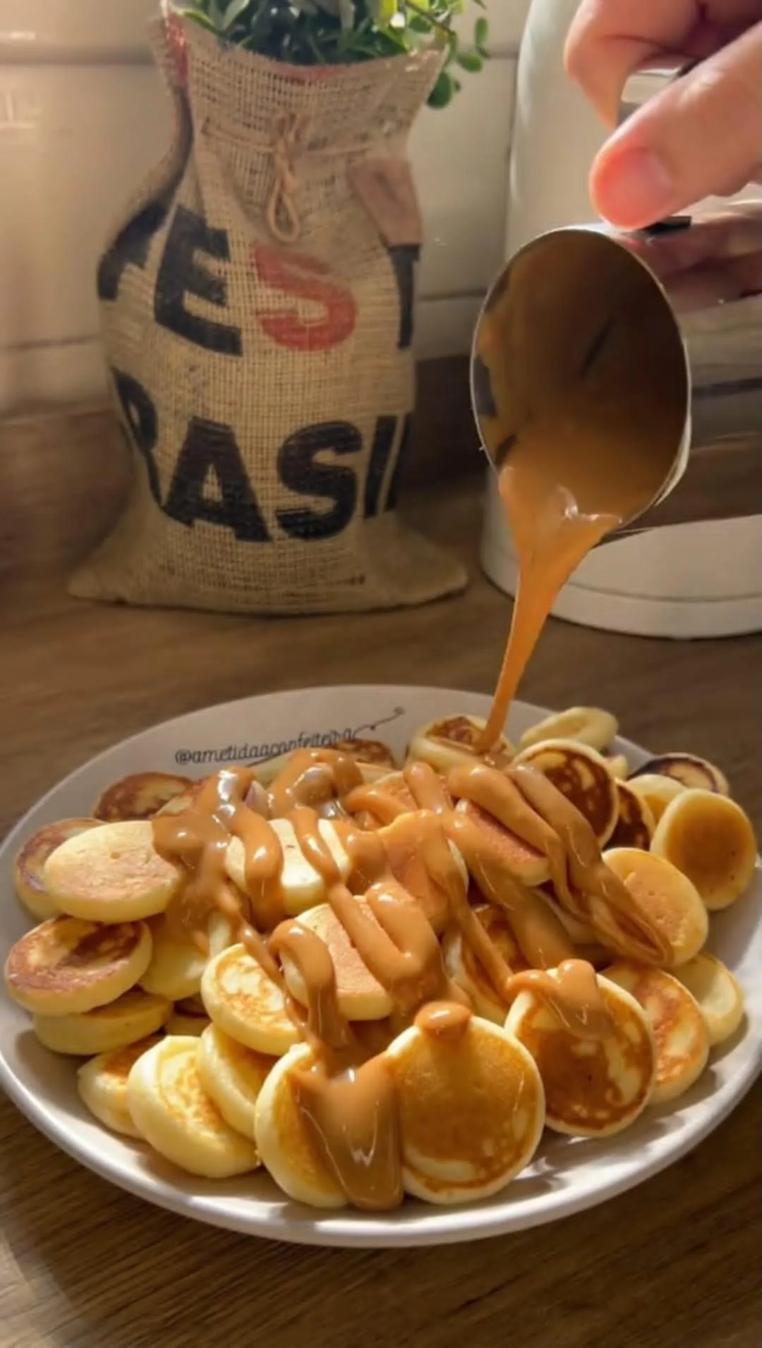 Ніжні, пухкі міні панкейки, политі густим карамельним соусом — ідеальний сніданок або десерт до чаю. Простий рецепт, який легко приготувати вдома. 📝 Інгредієнти (на 3–4 порції) Для панкейків: Для карамельного соусу: 👩‍🍳 Спосіб приготування